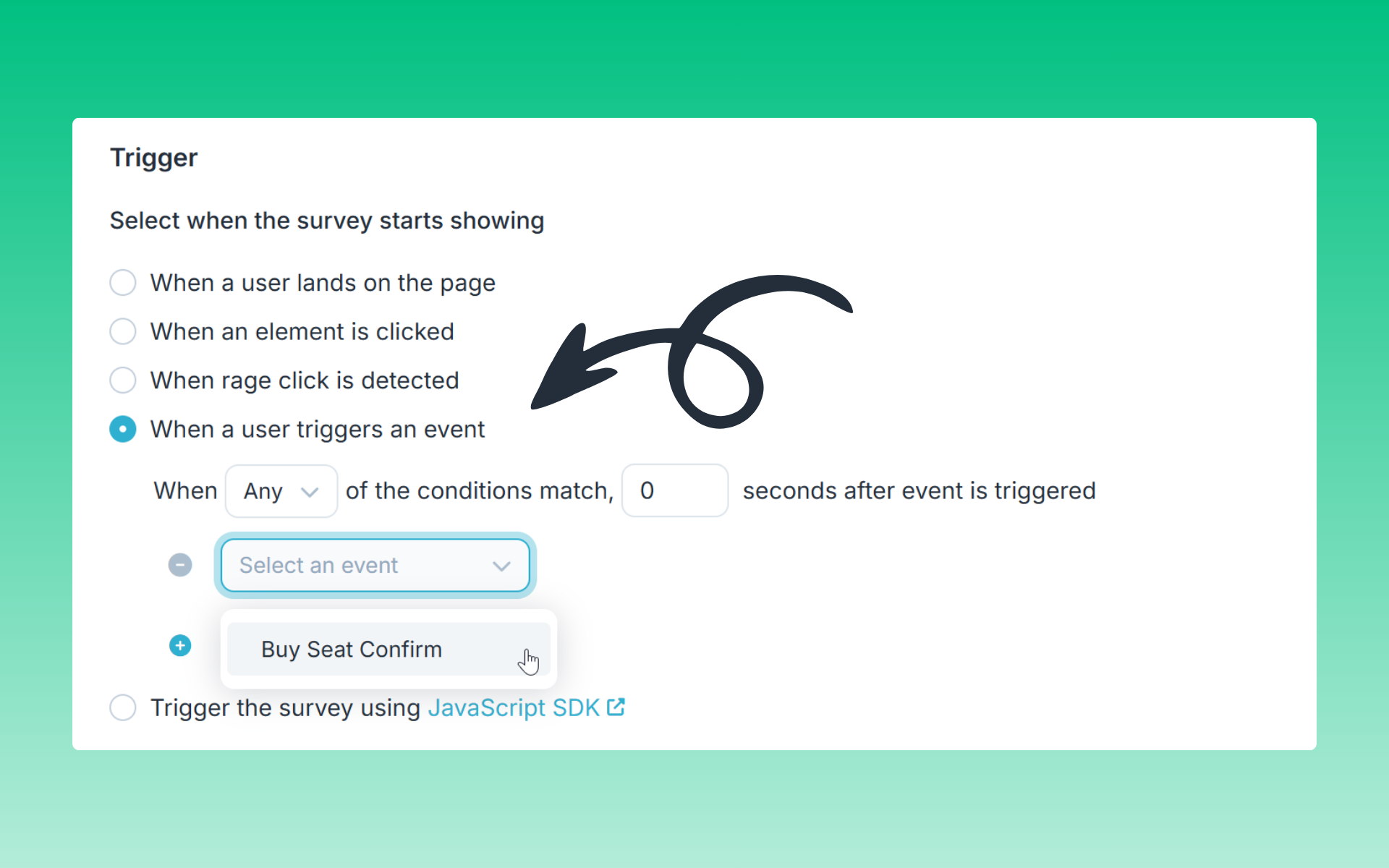 Want to launch a survey after a user completes onboarding, finishes a purchase, or clicks a specific button? Simply define your custom events using our JavaScript SDK, then select them as triggers in Userback.