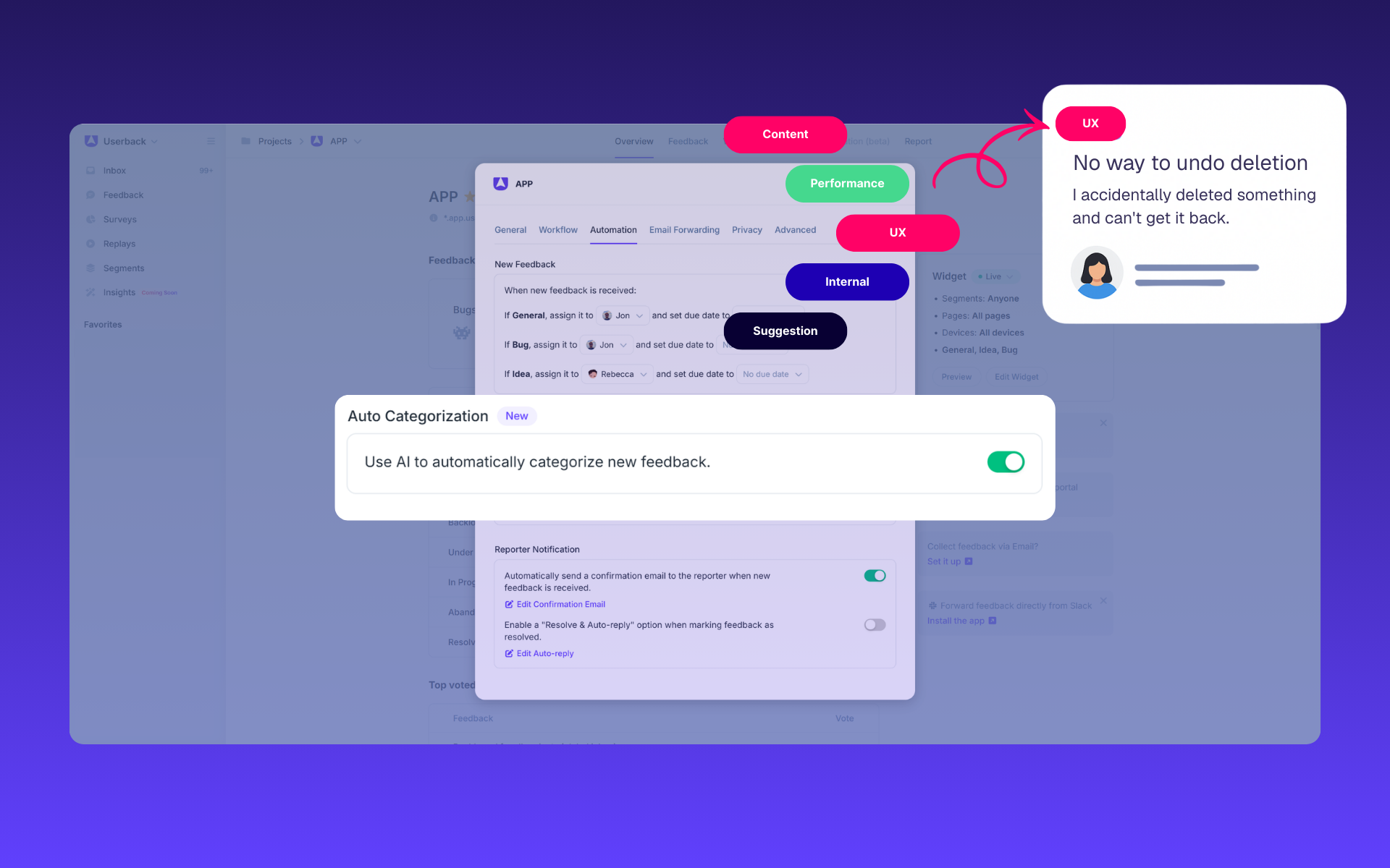 It uses AI to automatically assign the best-fit category to every new piece of feedback...so you spend less time categorizing and more time taking action.