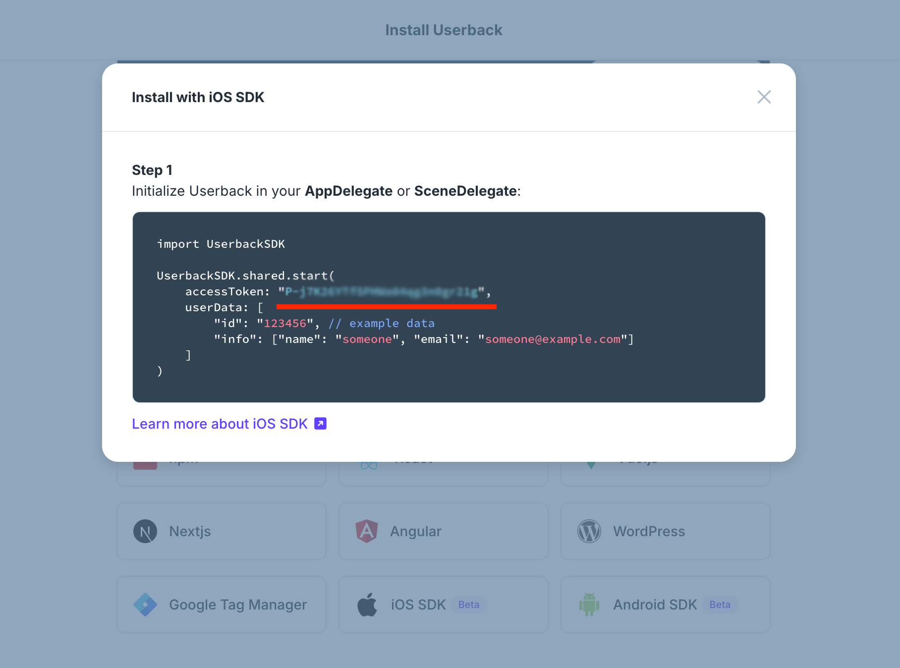 To install Userback for iOS & Android, you will need an access token. You’ll find that in Code Install (top right corner) -> iOS SDK or Android SDK