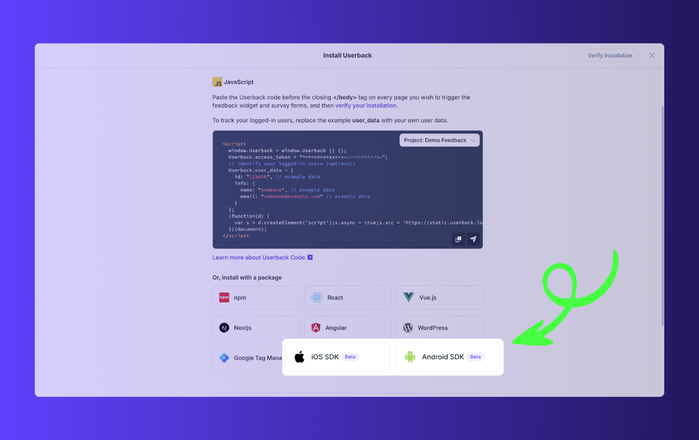 To install Userback for iOS & Android, you will need your projects access token. You’ll find that in the installation instructions for both iOS SDK and Android SDK.